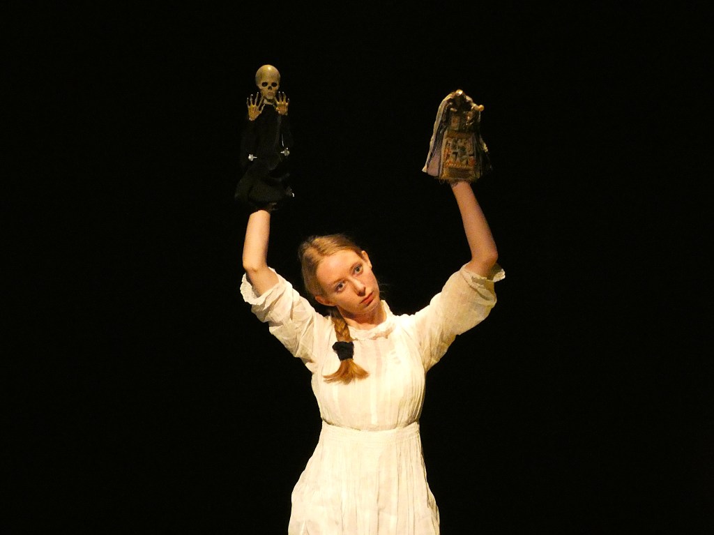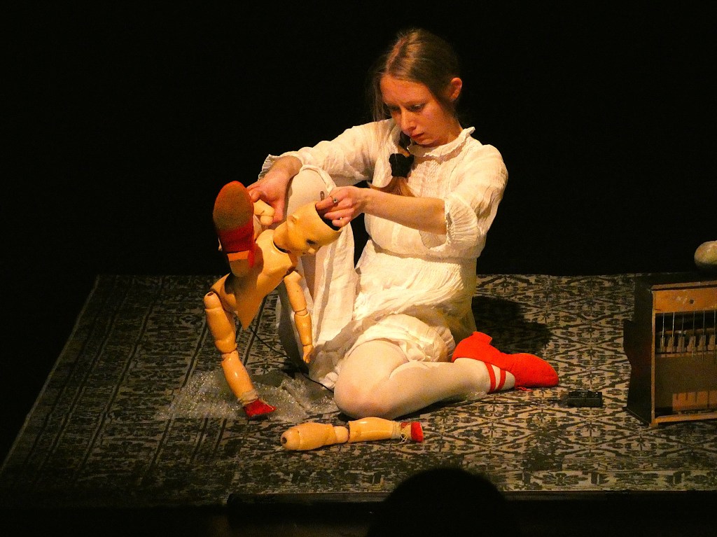 Un cycle de vie se dessine petit à petit sur scène, le personnage erre entre jouets d’enfance et carcasse de fin de vie, évoluant entre la jeune fille et la poupée. Cette sorte d’Alice au pays des Automates qui vacille entre le familier et l’inquiétant, trouve son écho, son double et son morcellement parmi les objets inanimés.